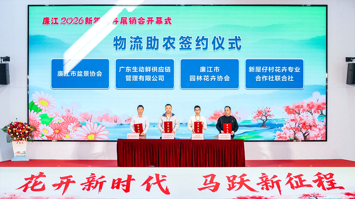 现场还举行了物流助农签约仪式,广东生动鲜供应链管理有限公司与相关协会、合作社签署合作协议,助力打通产销对接堵点。期间,主办方为2025年度廉江市“十大花匠”颁发证书,表彰他们在花卉种植技艺传承与产业提质升级中的卓越贡献。